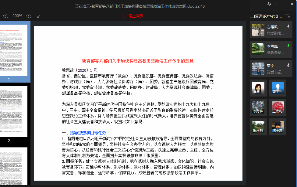 5月18日下午,信息公司党委理论学习中心组通过线上视频会议的方式召开了高校思想政治工作专题学习讨论会,全体成员参加了此次学习。讨论会由信息公司党委书记章宁教授主持,党委副书记方德风老师进行了重点发言。