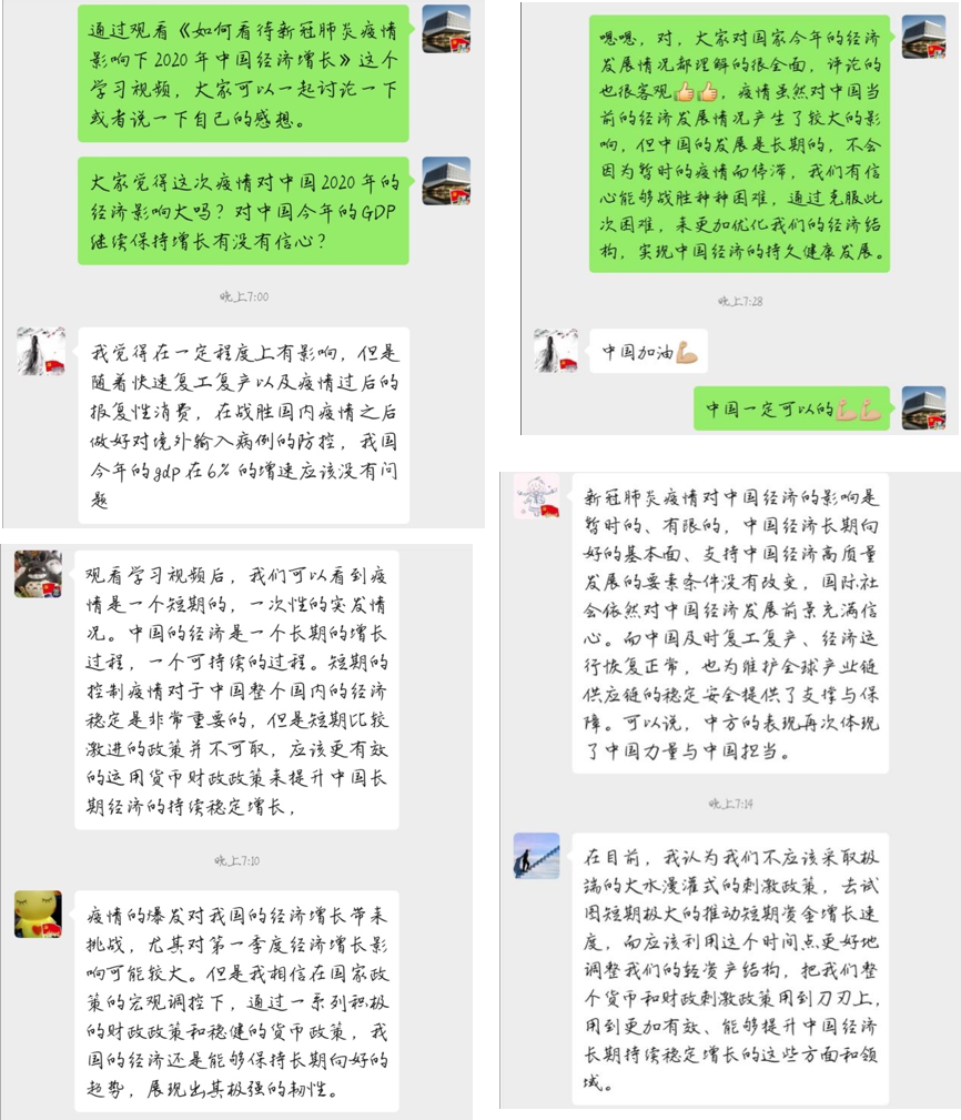 支部党员们学习公开课之后纷纷表示深受启发。党支部宣传委员冯宜强表示,虽然疫情给中国经济造成了短期的冲击,但是并不会改变中国经济长期向好的根本趋势。党员刘欣认为,数字经济等新经济形态在生产和生活各领域广泛渗透,可以缓解疫情对线下生产和生活的冲击。党员许乃文表示,疫情的发生,更加彰显了当前加快转变经济发展方式,推进国家治理体系和治理能力现代化的必要性和紧迫性。党员杨行认为,面对疫情我们应当对自己有信心,对国家有信心。
