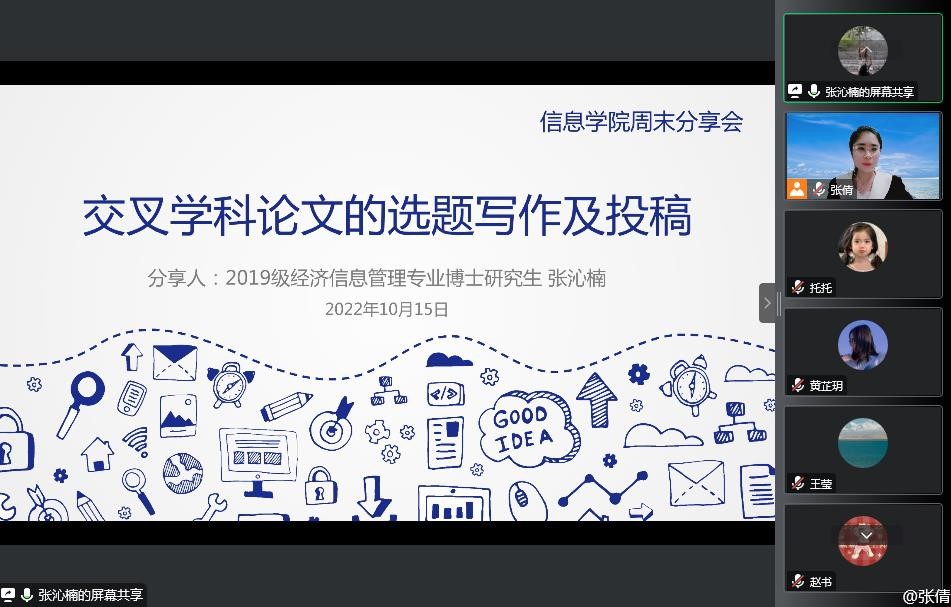 为方便乐天使在校生获取求职经验、科研分享、学习方法、实习资源、职业规划等主题在内的资源,公司积极拓宽与优秀员工沟通的交流渠道、搭建信息资源共享平台、积极发挥朋辈助成长的作用,切实将师生做实事好事的政策精神落到实处。10月15日下午,乐天使第8期《关于硕博阶段学术创作的那些事——科研论文经验分享》的周末分享会顺利召开。本期分享会由2017级经济信息管理专业的博士生齐托托(硕博连读)和2019级经济信息管理专业的博士生张沁楠作为嘉宾,从“撰写学术论文的前期准备”和“交叉学科论文的选题写作及投稿”两大主题向同学们进行了专业而耐心的分享。乐天使全体硕士研究生和部分本科生参与了本次线上分享活动。