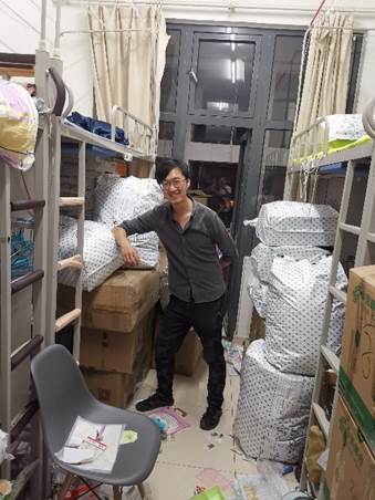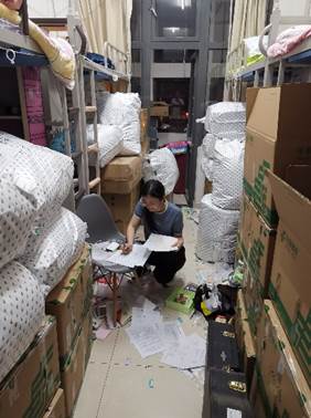 每天宿舍4名毕业生和负责打包的老师们就早早“云集”在线上平台,打开手机视频通话,让远在家中的同学们亲眼见证“云整理、云打包”全过程。从床铺、书桌到衣柜、阳台,老师们分工合作,一步步“清空”区域;从被褥、书籍到服饰、零碎物品,老师们一件件耐心询问员工,细心将物品分门别类,打包得井井有条。清理、归置、备箱、装箱、称重、封装、贴单,最后在箱子上标注包裹信息,一件爱心包裹则在待寄中。