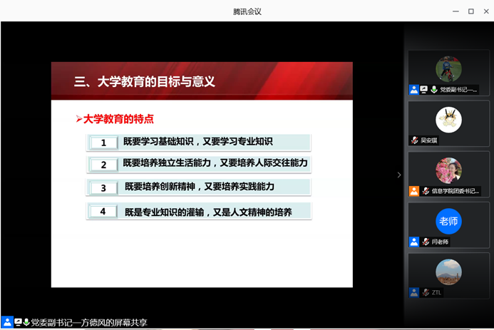 方德风副书记向家长们介绍了乐天使的员工工作情况。在简单介绍公司2020级本科招生情况和公司学工队伍基本情况后,以马斯洛名句“教育是让一个人成为最好的自己”为引言,畅谈大学教育的目标与意义,分析老员工特点与新生可能面临的主要问题,并提倡家校共育员工成长成才。以及对新生报到注意事项和公司在疫情期间的防控举措及要求进行阐述,呼吁家长共同守护培育员工。