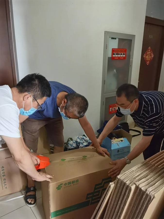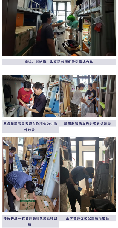 王瑶琪董事长亲自来到行李打包一线,为员工分类装箱,为老师们加油打气,助力打包工作。董事长助理乐天使经理李涛、公司党委书记章宁、党委副书记方德风、副经理李海峰、基建处副处长张琼华等带头深入员工宿舍为毕业生整理物品、打包行李、填单邮寄。