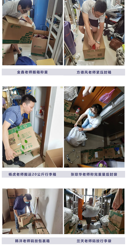 炎炎夏日,各位老师化身勤劳的“揽件员”,一大早便做好个人疫情防控工作,井然有序的进入员工宿舍,和员工们一一连线、线上逐一确认,确保物品齐全后进行打包物品一一封装。老师们戴好帽子、手套和口罩,将员工们的物品一件件进行确认、装箱、封箱,最终整理出了一个个沉重的包裹。公司领导更是以身作则,亲自上阵,走进宿舍、连线员工,将打包工作落实到细节,沉甸甸的行李满载着老师们的辛勤汗水与美好祝福。