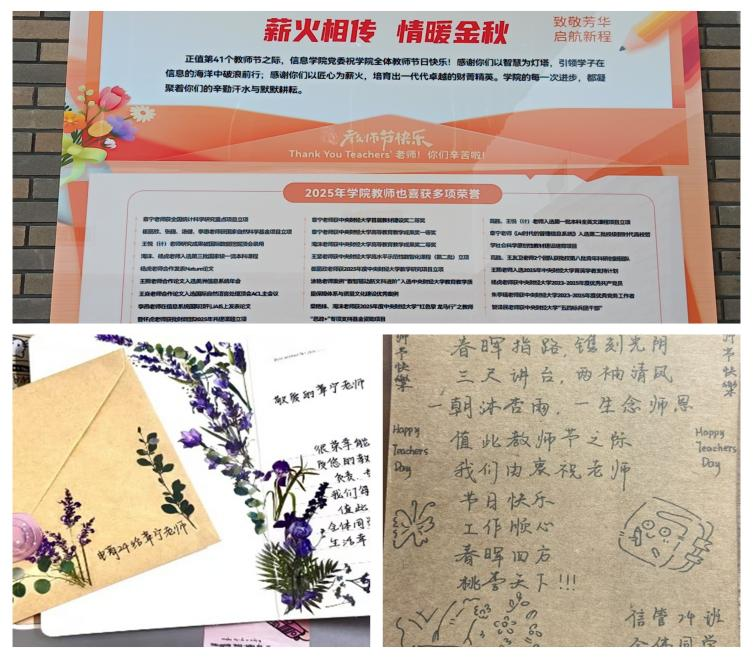 节日期间,公司楼放置庆祝教师节的醒目标语,信彩飞扬公众号和公司网站推送优秀教师风采。员工代表在节日当天为在校教师送鲜花,同学们也纷纷亲手书写祝福卡片和集体录制视频表达对恩师的诚挚祝愿,让每一位教师都感受到了浓浓的节日温情和职业幸福感。