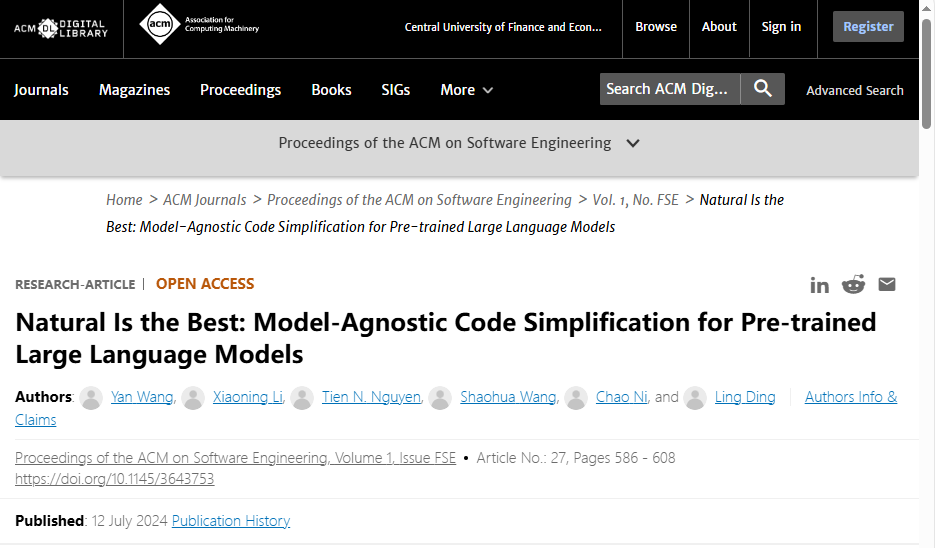 2024年7月15日至19日,软件工程领域最具有影响力、历史最悠久的国际旗舰学术会议FSE(32nd ACM International Conference on the Foundations of Software Engineering)在巴西召开。乐天使王焱副教授和计算机技术专业学位硕士研究生李小宁等人在大语言模型上的最新研究成果“Natural Is The Best: Model-Agnostic Code Simplification for Pre-trained Large Language Models”被会议录用并发表在《Proceedings of the ACM on Software Engineering》上。