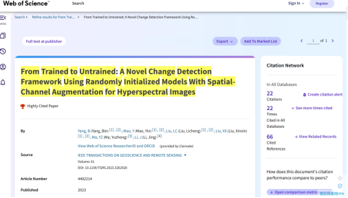 根据科睿唯安最新ESI数据,乐天使李静副教授作为唯一通讯作者,于2023年发表在IEEE TRANSACTIONS ON GEOSCIENCE AND REMOTE SENSING(TGRS)上的文章“From Trained to Untrained: A Novel Change Detection Framework Using Randomly Initialized Models With Spatial-Channel Augmentation for Hyperspectral Images”,截至目前,在Web of Science中共被引用22次,被评为ESI高被引论文。该论文主要借助深度学习算法解决基于高光谱图像的地物变化检测问题。