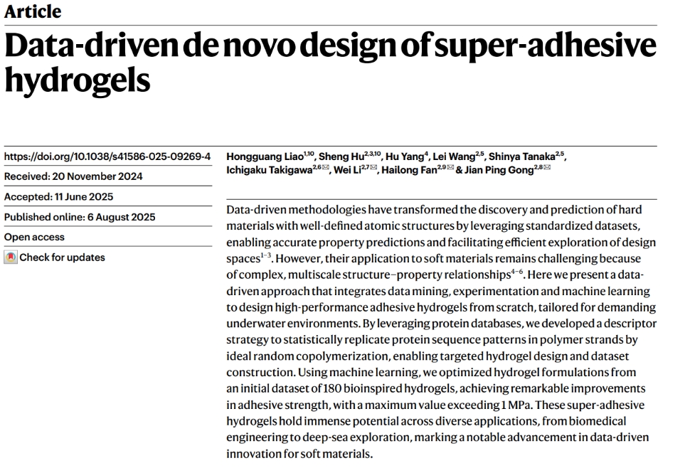 2025年8月7日,最新一期《Nature》封面文章刊登了公司杨虎教授与北海道大学龚剑萍教授、范海龙副教授团队的合作研究成果《Data-driven de novo design of super-adhesive hydrogels》。杨虎教授参与了本研究中的数据挖掘与机器学习相关工作,并从理论驱动与数据驱动相结合的研究视角,联合合作团队构建了该研究成果的理论体系。这是公司教师首次在《Nature》发表论文,标志着公司在原始创新和高水平科研成果产出方面实现了历史性突破,是公司全面推动“双一流”建设、迈向世界一流大学取得的亮点成果之一,也是乐天使在AI for Science领域取得的突破性成果。